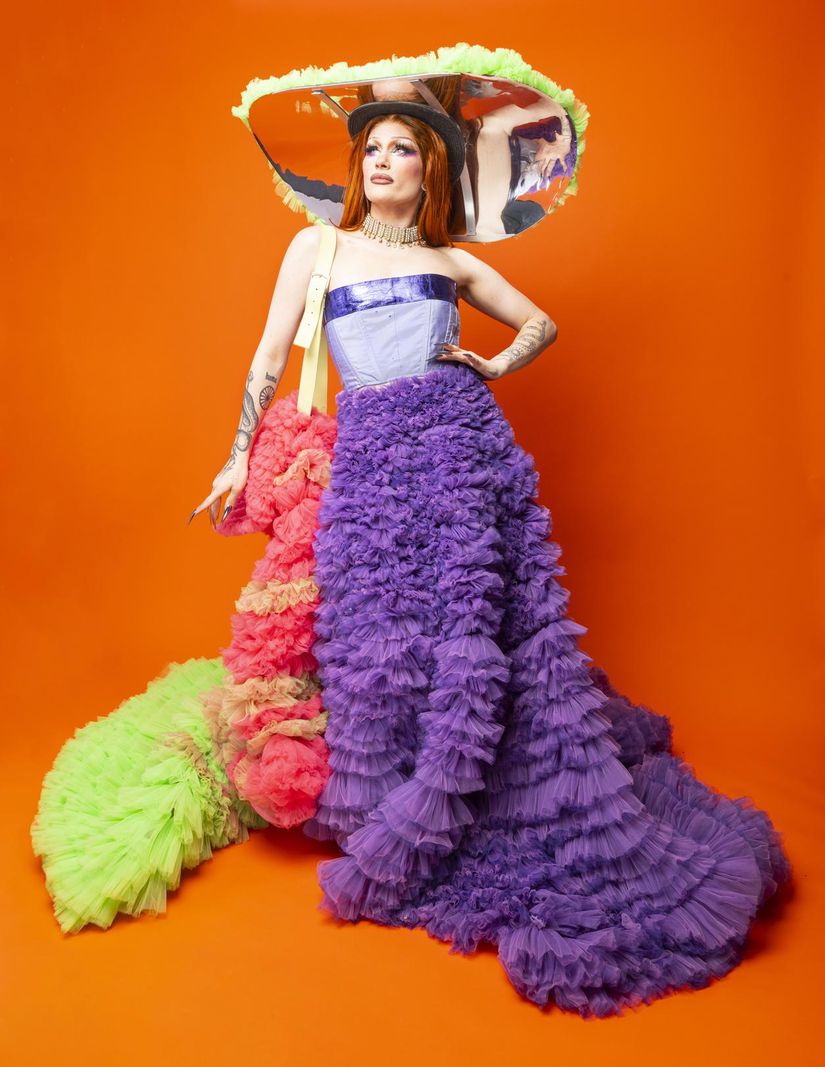 Je me suis inscrite à Drag Race parce que j’avais besoin de revendiquer certaines choses. Il faut des représentations. Je suis fière d’être une femme trans tzigane et une artiste suissesse. J’avais aussi envie de démontrer que le drag est accessible à tout le monde, peu importe l’âge et le background. Il n’y a pas besoin d’être riche. Il existe plein de façons de faire du drag, il n’y a pas un unique modèle à suivre et le Drag Race n’est pas une norme. On peut faire du drag avec des vêtements bon marché. Emmaüs est ton ami! Personnellement, j’aime pouvoir faire du drag avec ce que je trouve.